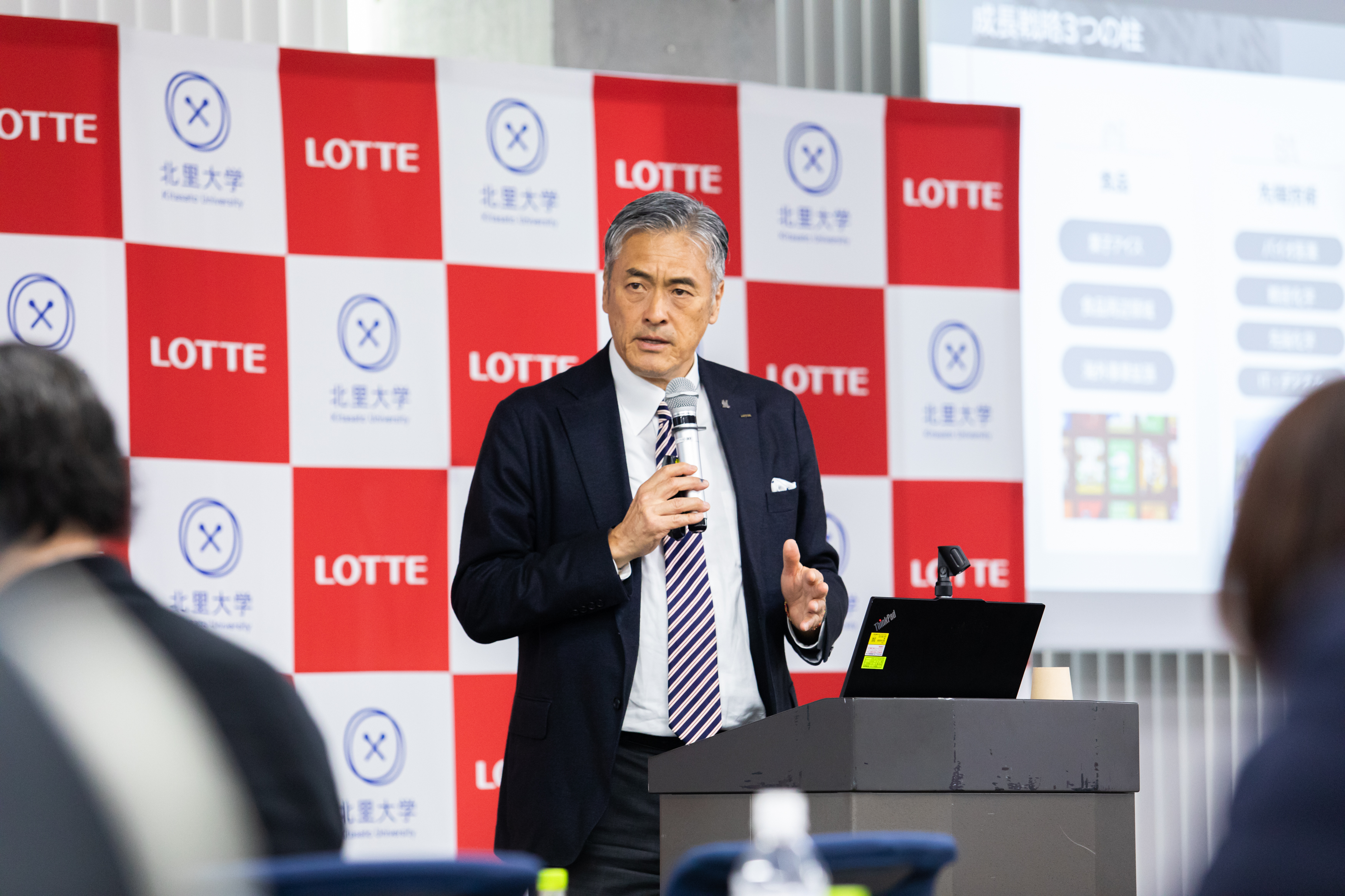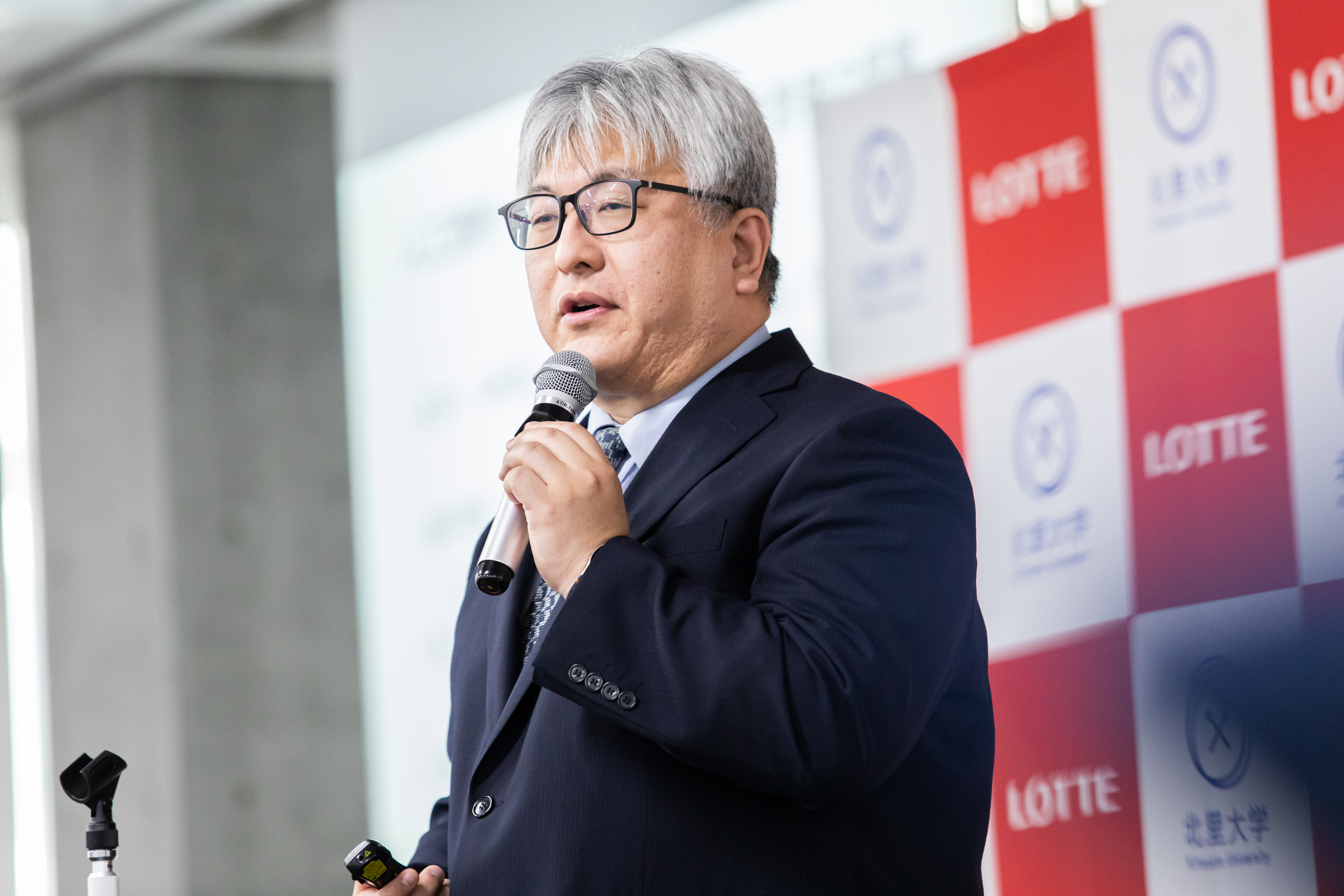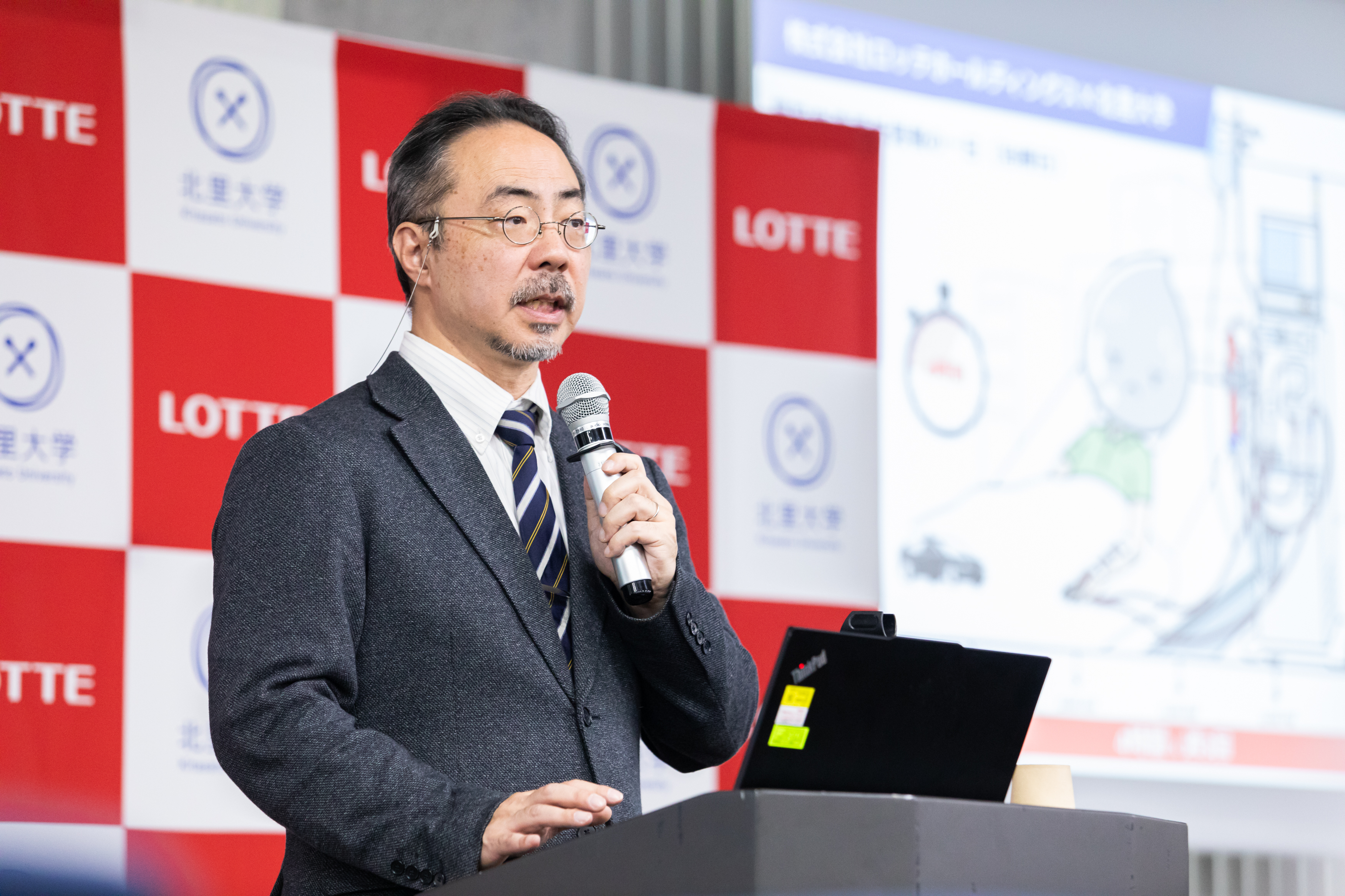 冒頭、ロッテホールディングス代表取締役社長CEO、玉塚 元一が登壇し、ロッテグループが展開するヘルスケア・バイオ医薬事業について語りました。祖業のガムを軸とした「噛むこと」の研究・啓発に加え、日韓連携によるグローバルCDMO(医薬品開発製造受託)企業・ロッテバイオロジクス(本社:韓国ソウル)の設立や、革新的な技術を持つスタートアップに投資するCVC(コーポレート・ベンチャー・キャピタル)の立ち上げによって、世界が抱える健康・社会課題の解決に挑んでいることを説明。「大がかりな設備を必要とする食品や化学分野で培ってきた高い製造技術と品質管理のノウハウ、さらに日韓ロッテの力を結集し、ヘルスケア・バイオ医薬分野でも新たな付加価値を提供していきたい」と述べました。