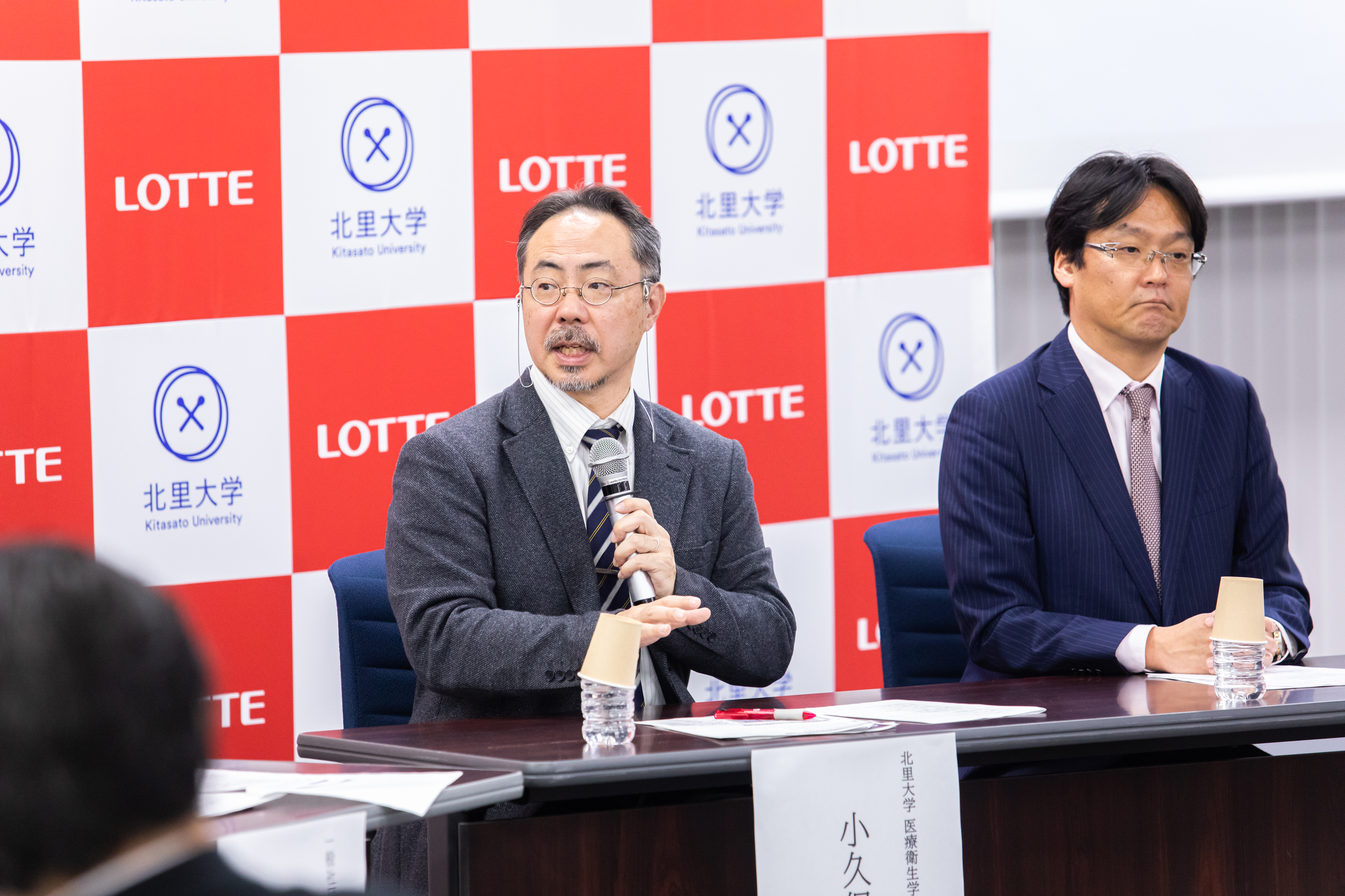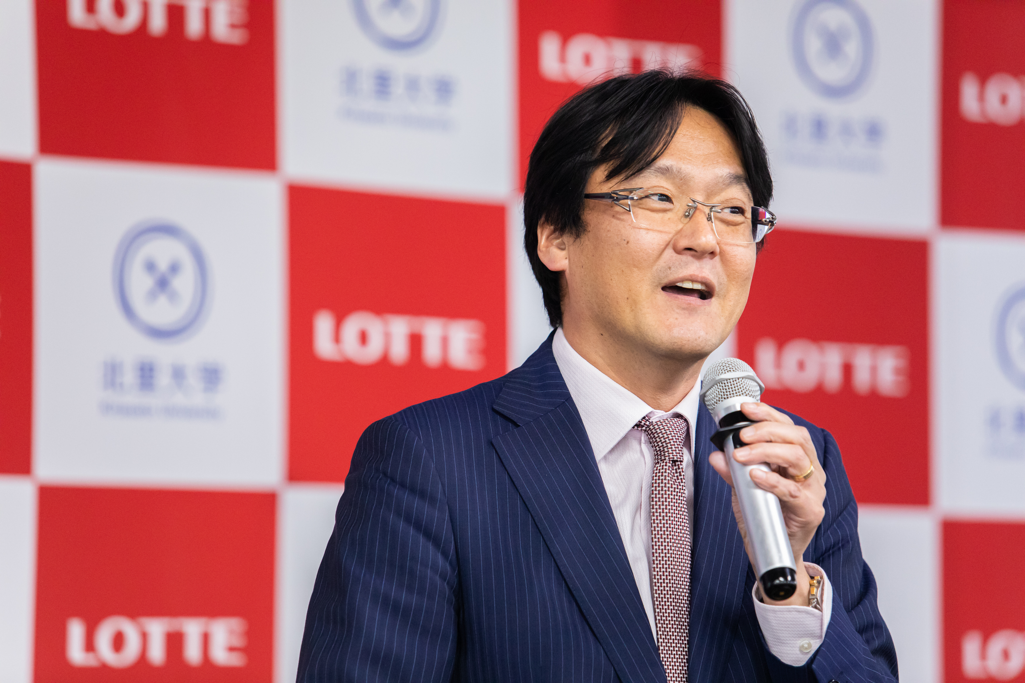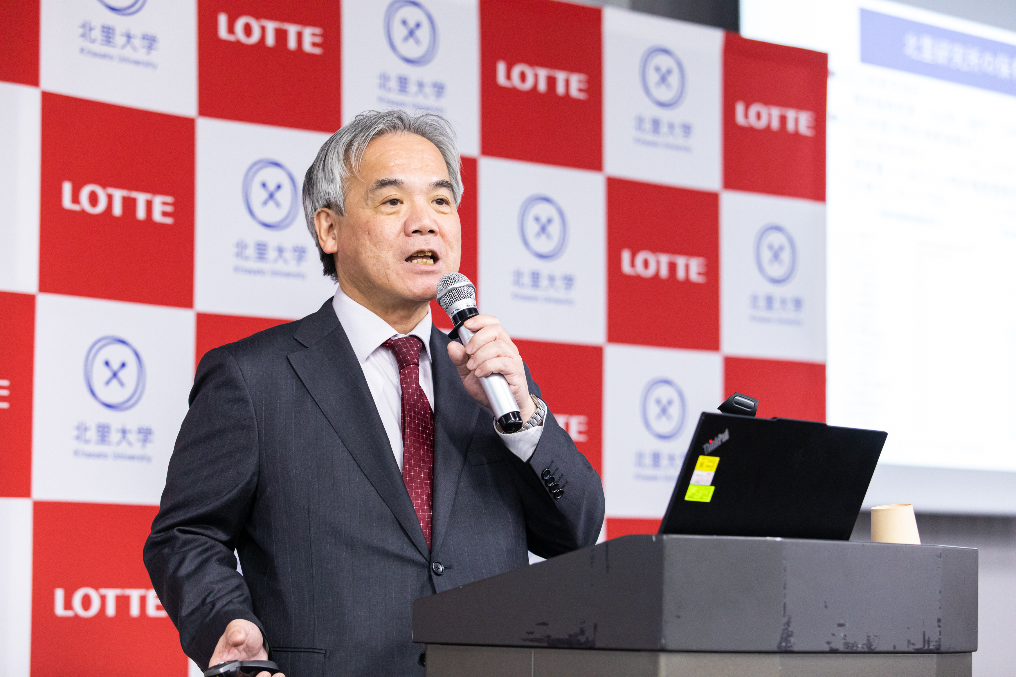 冒頭、ロッテホールディングス代表取締役社長CEO、玉塚 元一が登壇し、ロッテグループが展開するヘルスケア・バイオ医薬事業について語りました。祖業のガムを軸とした「噛むこと」の研究・啓発に加え、日韓連携によるグローバルCDMO(医薬品開発製造受託)企業・ロッテバイオロジクス(本社:韓国ソウル)の設立や、革新的な技術を持つスタートアップに投資するCVC(コーポレート・ベンチャー・キャピタル)の立ち上げによって、世界が抱える健康・社会課題の解決に挑んでいることを説明。「大がかりな設備を必要とする食品や化学分野で培ってきた高い製造技術と品質管理のノウハウ、さらに日韓ロッテの力を結集し、ヘルスケア・バイオ医薬分野でも新たな付加価値を提供していきたい」と述べました。